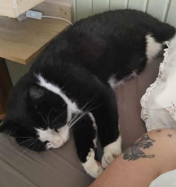 Stor og kosete, glad i folk, tillitsfull. Spesielt mønster i det sort/hvite på forlabbene. En hvit strek i det sorte.