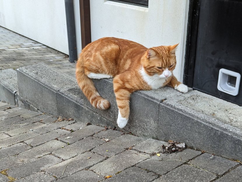 Han er oransje med hvitt rundt snute, på hals og på nederste delene av labbene.
