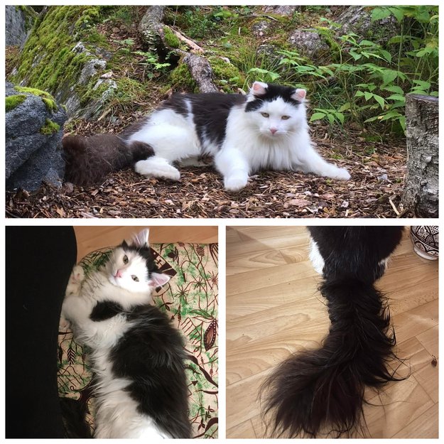 Stor langhåret hannkatt, svart og hvit med hvite ører og lang bustete hale.
