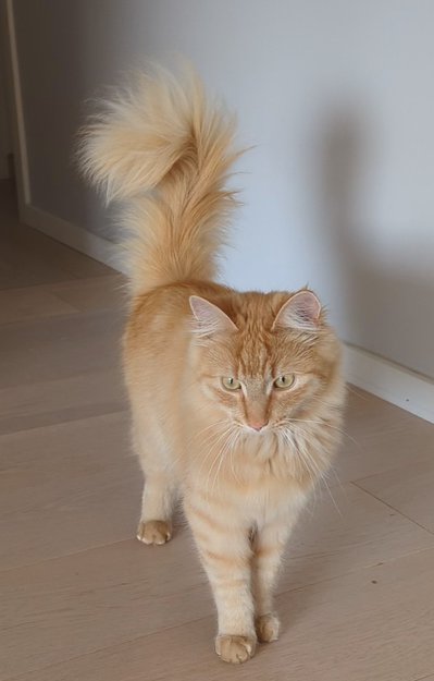 Semilanghåret. Ganske stor fluffy hale. Krage. Tykkere vinterpels enn på bildet. Små dusker på ørene.