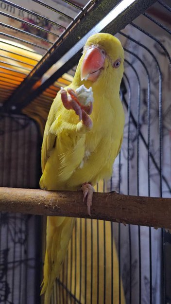 ~ Erle ~ 🩷 er gul med røde øyne. Fargemutasjonen hun har kalles for grå/grønn lutino. Hun har litt lysere kanter ytterst langs vingene og på halepartiet.