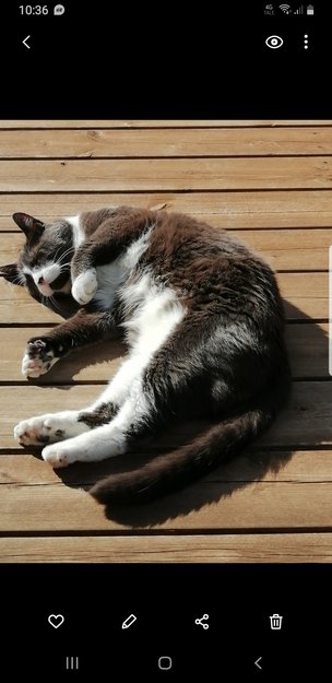 Mørk grå med hvite poter og bryst. En ekstra tå på hver pote. Ingen halslenke men chippet med tatovering i øret. Veldig tam og sover alltid hjemme. 10 år gammel.