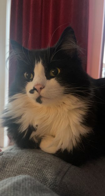 Svart langt hår, hvit på halsen og nesen med en svart flekk på siden av nesen
