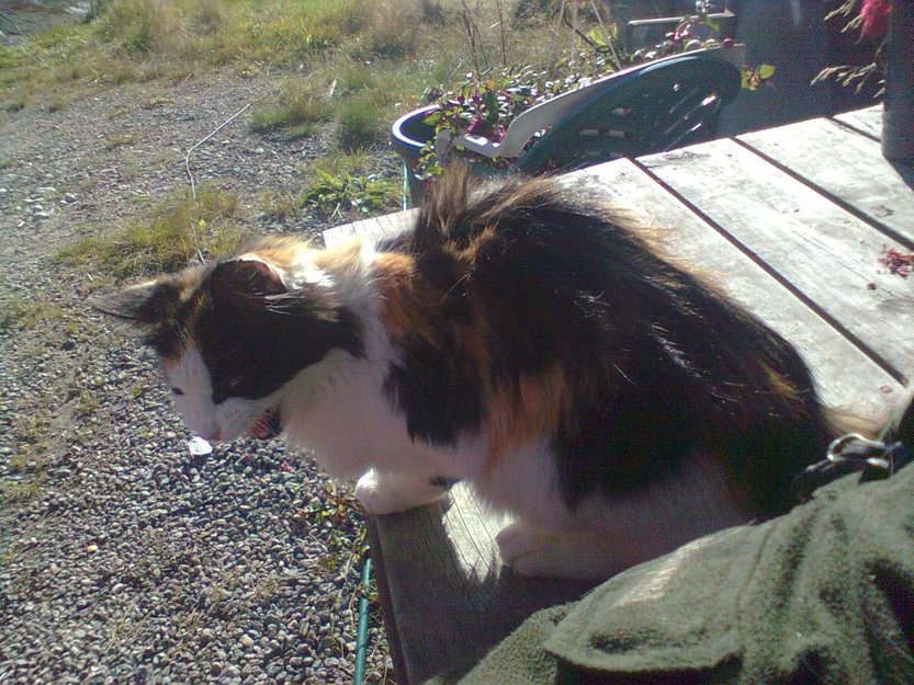 den ble observert rundt huset. så en dag stod den på hode i en sekk med hundefor vi hadde stående i bua. Den er veldig tynn. Den har nok gått ute en stund, men er ikke en villkatt, for den er veldig kosete og tillitsfull.