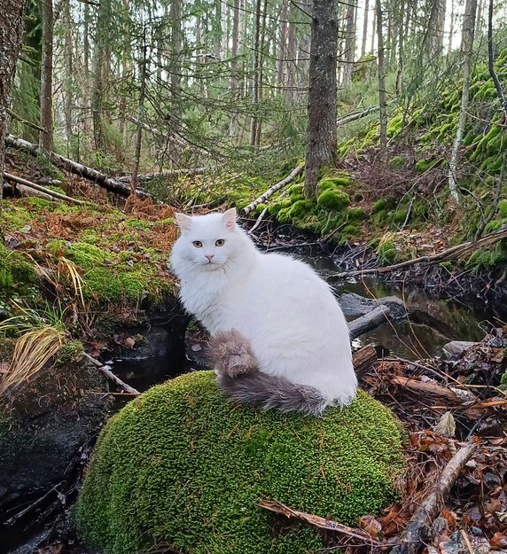 Hvit med grå hale. Tatovering i øret. Grå flekk under ene bakbeinet.