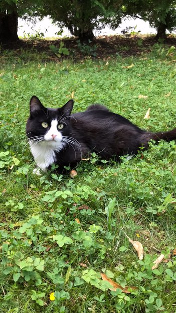 Hvitt mønster i ansikt, hvite poter, ellers sort.