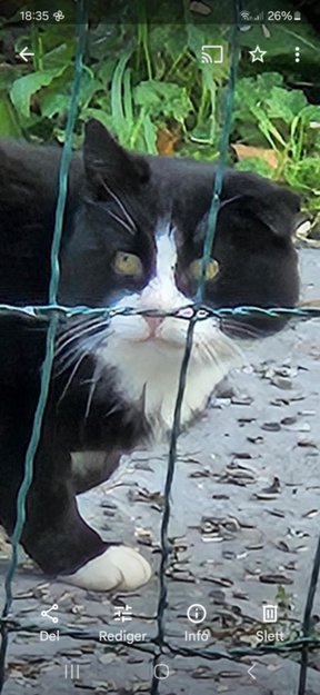 Sort/hvit katt. Hvit på forlabber. Hvit på halsen, munnen og en stripe mot panna.