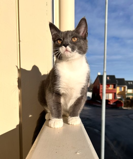 Han er en stor katt på 2 år. Han kan være redd og skeptisk til alt han ikke kjenner til, men hører han lyden av mat og godbiter, kommer han løpende. Han har et kutt på ene øret. Munnen er rosa og snuten er mørk. Potene er flekkete med de samme fargene.