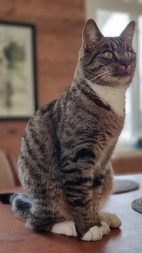 Gråstripete med hvitt bryst og hvite labber. Snill og god katt.