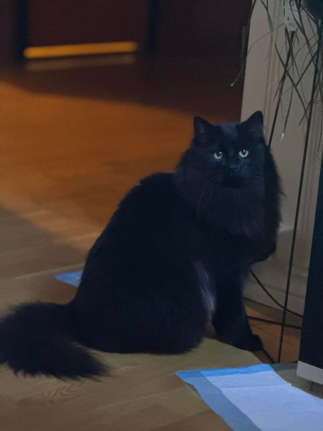 Han ble skremt av fyrverkeri! Han har vanligvis gps tracker, men denne var tom for strøm. Den skal henge rundt halsen fortsatt. Helt svart langhåret, med en hvit/grå sjattering på magen.