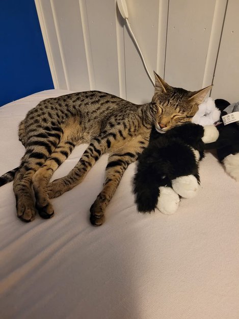 Dette er en savannakatt med mye lyd i. Ikke aggressiv, behagelig fyr.