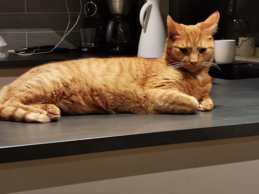 2 år gammel oransje katt med brune striper. Normal størrelse. Korthåret. Katten er kastrert og chippet.