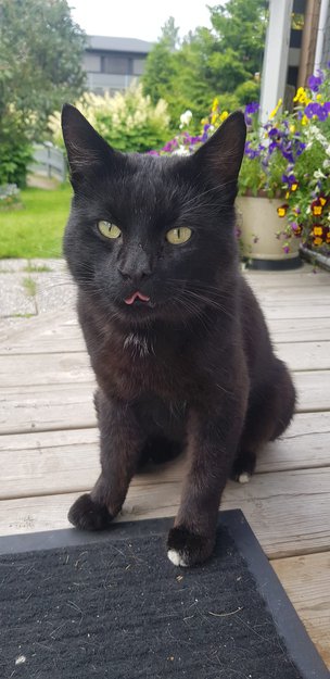 Katten er svart med små hvite flekker på kroppen (en på magen, en ved halsen og små på labber.