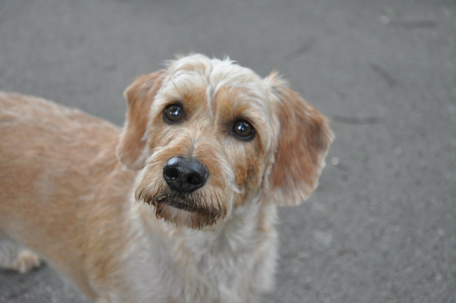 Svært lys og "myk" strihåret Dachs. Langbent.
