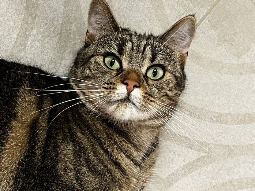 Blanding av bengal og perser. Har spraglete pels i brun, beige og sort. Brun snute, hvit rundt munn og under halsen, beigerosa buk med lengre pels og mørkere flekker på magen. Sorte bakbein. Grønne øyne. Lang og ganske kraftig hale mørk oppå og lysere under.