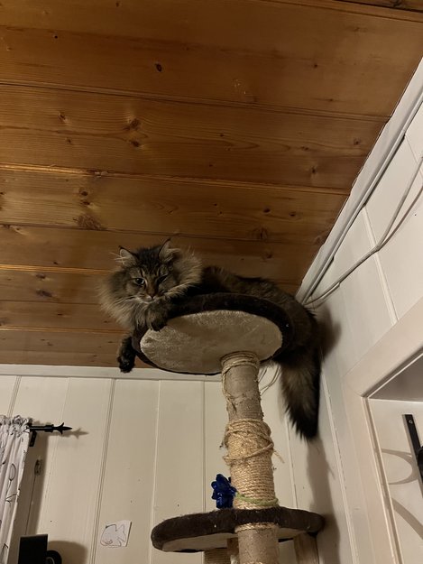 Han er skipskatt, og har store poter foran og bak. Krøllete under magen. Lang pels og skikkelig manke. Grønne øyne.