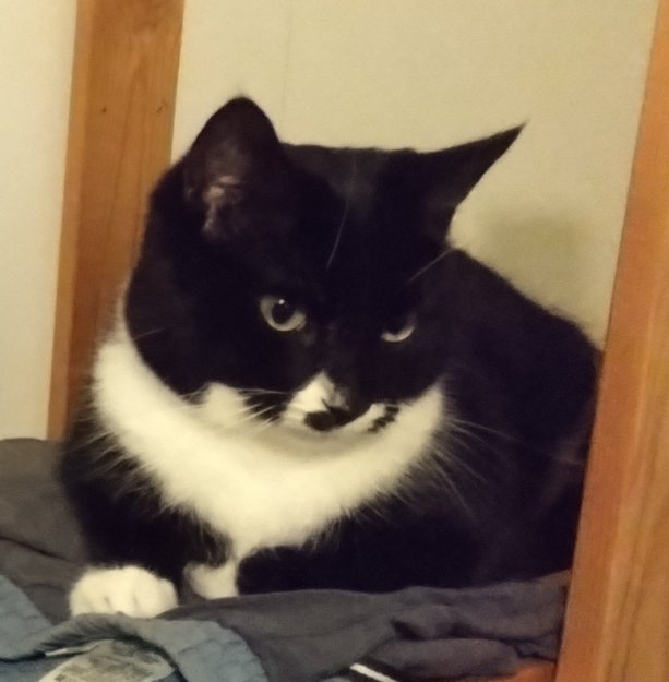 Sort og hvit ung voksen hannkat med enhviit flekk delvis rundt nesen.