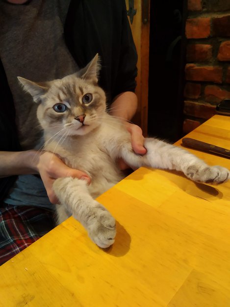 Hannkatt, rundt 5kg, 7år, med chip for enkel identifisering, hvit og grå korthåret pels, blå øyne, innekatt. Ikke vant med andre mennesker og dyr, blir lett redd og gjemmer seg i små rom som under terrasser og bak søppelsekker.