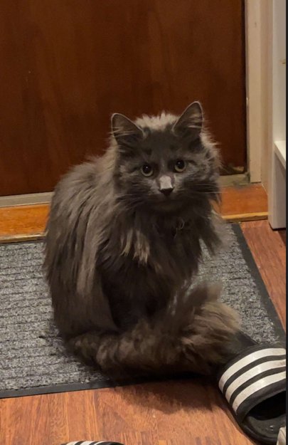 Tynn pjuskete katt med lang grå pels. Han har ikke halsbånd på seg da han mistet det. Han har store gule øyne.