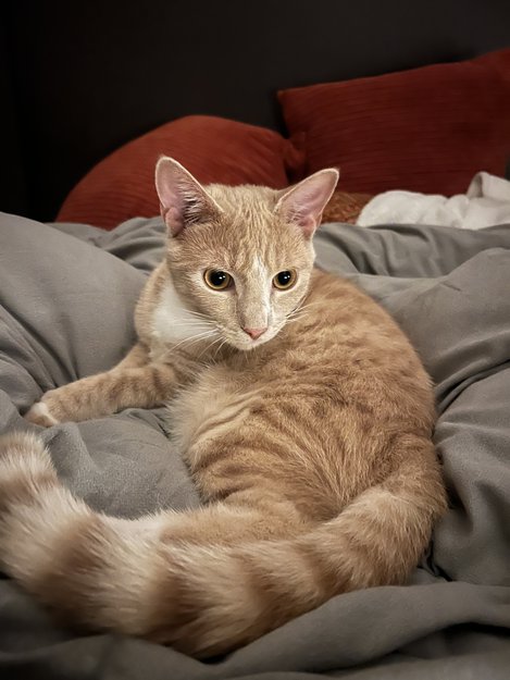 Ganske liten lys oransj katt som gjerne er litt engstelig og skjelven.