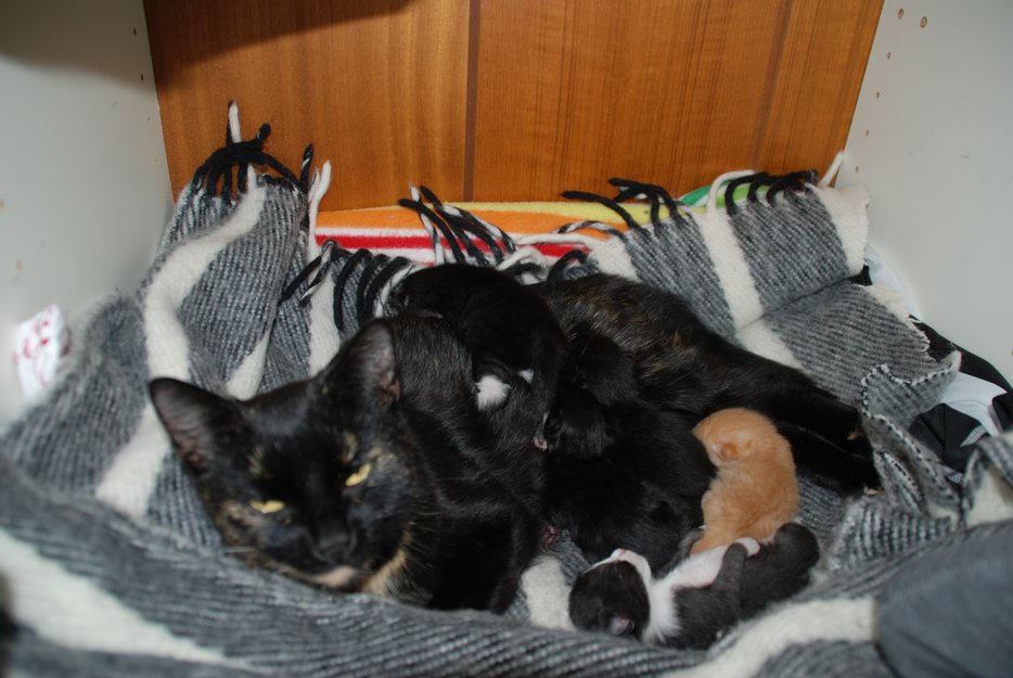 Jeg så den først i midten av juli 2012, da så det ut som en kattunge. Den var enormt tynn, sulten og sky så jeg begynte å mate den i garasjen hvor vi har katteluke. Den var borte deler av august og da jeg så den igjen i september var den drektig. Jeg fikk den til slutt så tam at jeg tok den inn. Nå har den fått 5 nydelige kattunger. 4 Sorte med hvit flekk og en tigerfarget.