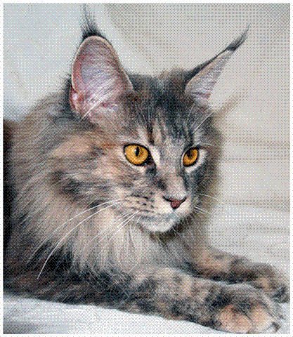 Hunnkatt, mainecoon, innekatt, har aldri vært ute, grå med rødt og hvitt i blanding (skilpaddefarget)