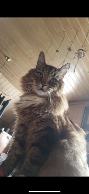 Norsk skogskatt/maincoon, hvite poter, kutt ved det ene høre, floker i pelsen,