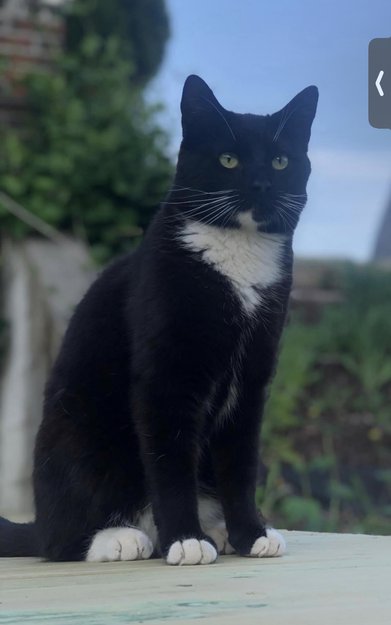 Halv hvit hake. Veldig kosete og kontaktsøkende. Han er pratsom og veldig glad i mat.