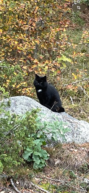 Kjønn? ikke stor av vekst har sort fin pels med litt hvitt foran på brystet. Ikke spesielt sky, sitter helt inntil inngangsdøren, ser opp på oss har nok lyst til å komme inn i huset men mister motet og går vekk med en gang døren åpnes for så å komme tilbake når døren lukkes igjen.