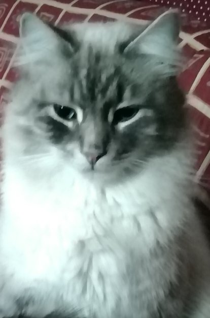 Vakkert svartmasket fjes, blå øyne, svarte ører med hvite hår inni, stor, svart hale, noe mørke bein. Pelsen forøvrig lys sjampagnefarget (eller lys røykfarget).