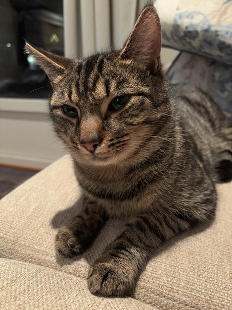 3 fettklumper på magen. Brunlig pels på magen. Tillitsfull og glad i mennesker. Liker ikke å ligge på fanget å bli bært. Glad i å bli klappet, være ute å spise
