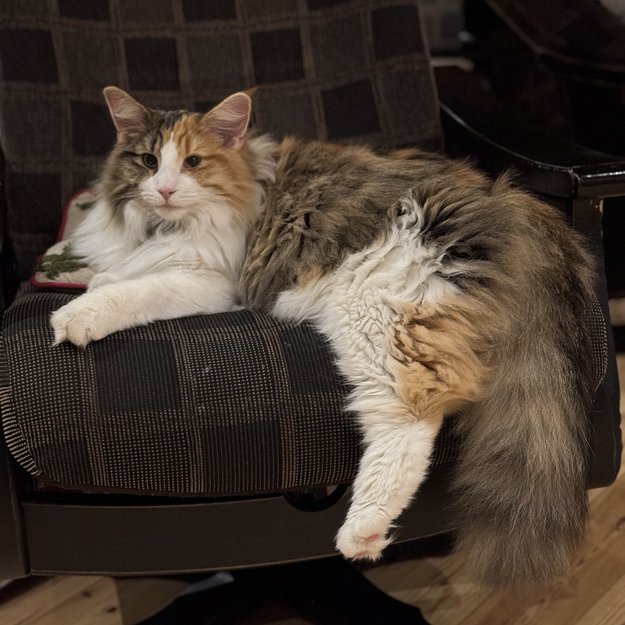 Hunnkatt av rasen Norsk Skogskatt. Rød og sort over rygg og hvit på magen. Halen er stor og vaskebjørn mønstret. Ansiktet er svart på en side og rødt på andre.