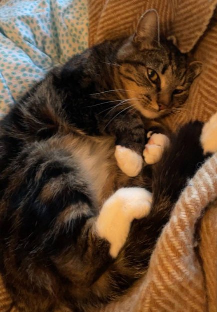 Beige,svart striper på kroppen og bakre føtteneer hvite mens fremre poter er hvite