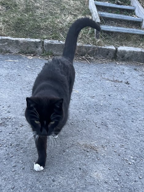 Korthåret sort og hvit katt som går i området. Lar seg klappe og er ikke sky. Katten er mager og har store klumper i pelsen sin som tyder på manglende stell, eller at den har gått ute en stund. Er skitten i pelsen. Lurer på om den kan ha gått seg bort.