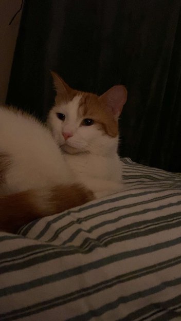 Orange flekk under magen og på begge bakbein. Han har også tatovering i øret