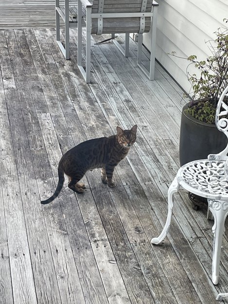 Katt observert flere ganger de siste månedene. Prøvde å få tak i for å sjekke chip, men uten hell. Fått mat og kos. Katten virker skvetten, men også kontaktsøkende.