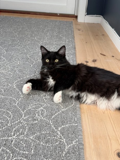 Hun er liten og søt. Sort med hvit på brystet og magen. Hun er ikke vant med å være ute, så hun er skeptisk og lettskremt.