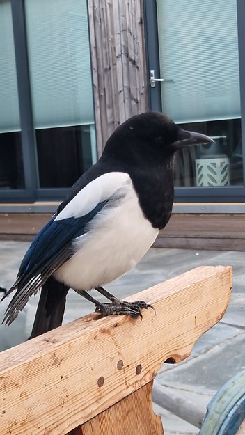 Pinken ble reddet da han var forlatt av foreldrene 3 uker gammel i juni i fjor. Da hadde han brukket bein og var underernært, hverken flyvedyktig eller gangfør. Han er fôret og har fått fly fritt ut og inn hos oss siden da, men har nå fløyet på eventyr. Han er ikke helt klar for å finne nok mat selv, riktig ennå. Han er nysgjerrig og uredd og oppsøker ofte folk ute. Han lander gjerne på en skulder, men er ikke farlig. Han kjennegnes ved hvite flekker på stjerten