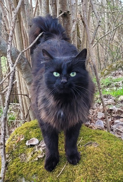 Sort/brun langhåret kosete katt holder til i skogen rundt Skullerud skole.