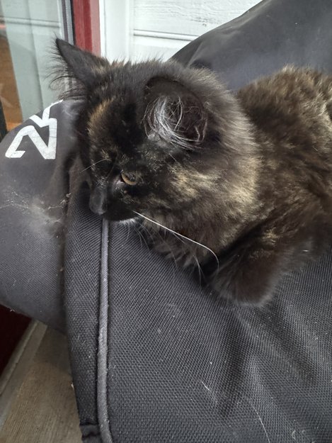Liten katt (kattunge?) fulgte etter min sønn og kjæresten sent i går kveld fra gymnasbanene til Bleikmyr ved Haraldsvang. Hun har rosa halsbånd, er spraglete, fint stelt, kommer nok fra et kjærlig hjem. Hun var sulten, fikk mat og vann. Har sjekket, er ikke chippet, heller ikke navn på halsbåndet. Har fått et bur med varme tepper til natten. Har sendt mail til Dyrebeskyttelsen. Kan ikke ta henne pga en labrador og to innekatter. Hun har holdt seg rundt huset siden i går kveld.