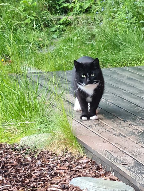 Flere har observert denne katten i nabolaget den siste tiden. Den kommer og spiser maten til katten vår på kveldene. Virker veldig sulten. Er sky og ikke mulig å få kontakt med. Stikker så fort han ser oss.