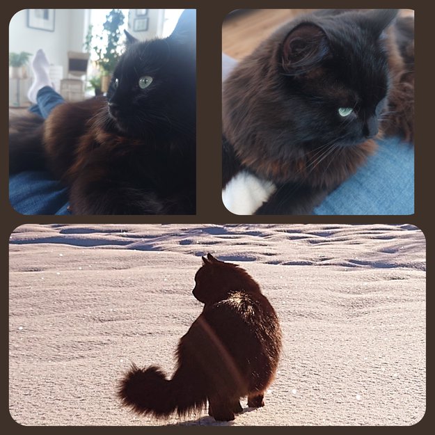 1 år gammel hannkatt. Veldig sosial. sort men et mindre brunt felt i halsregionen. Få hvite hår i halen