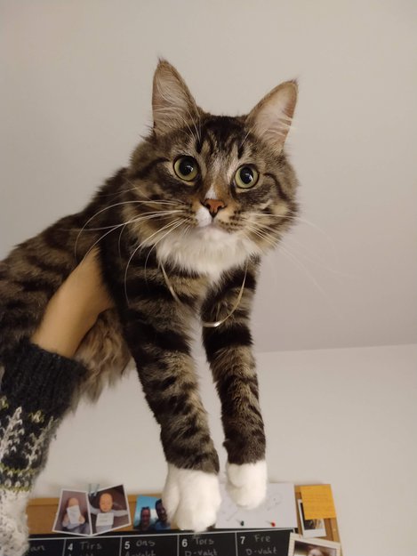 Benito har hvite poter både foran og bak, hvitt bryst/munn/nese, ellers grå/brun/svart pels på kroppen. Veldig kosete, kontaktsøkende og glad i mennesker.
