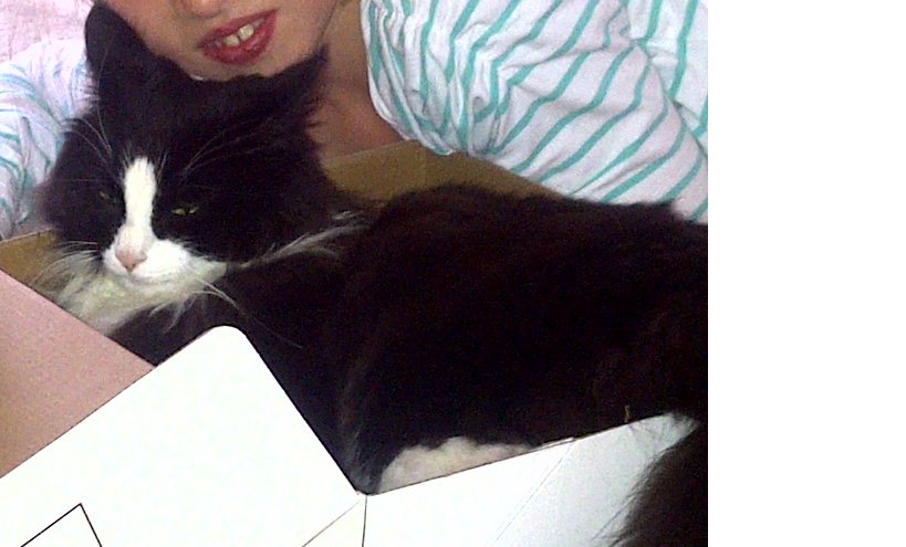 Svart og hvit og ganske langhåret. 1 år gammel og tillitsfull.