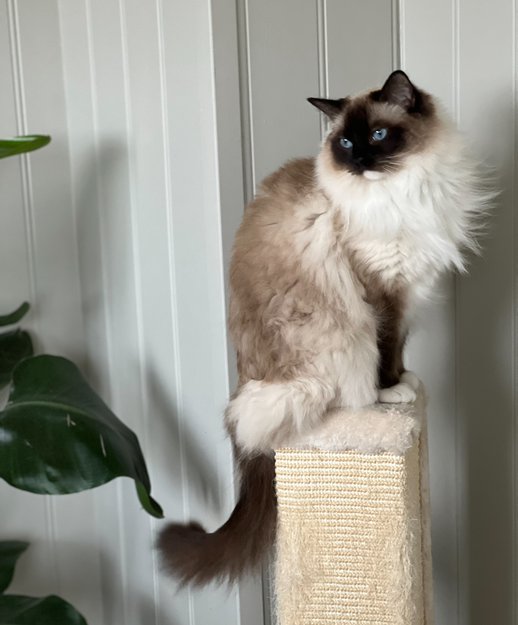 Stor flott Ragdoll, hvit pels med brunt på ryggen og mørkebrun markert ansikt, hale og bein. blå øyne