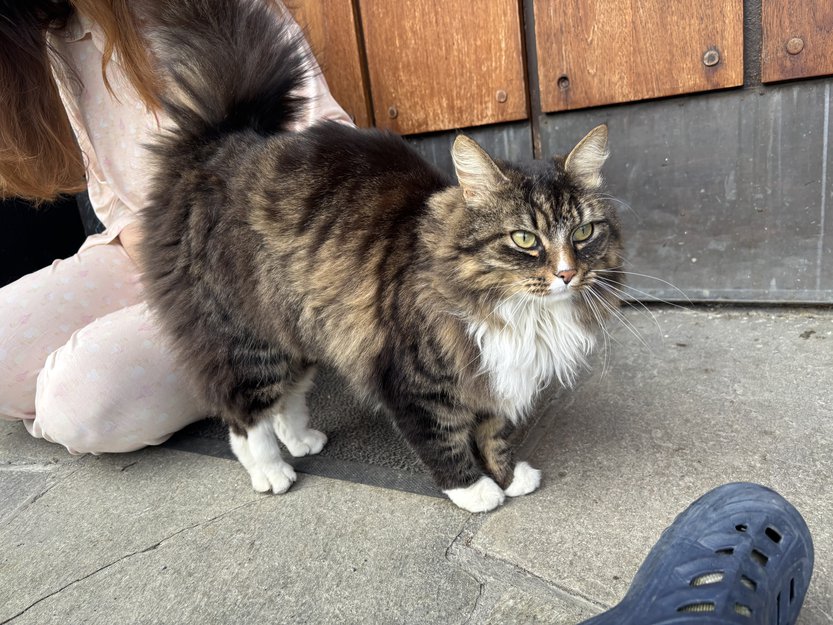 Vi så katten først i går kveld (20.04.25) og når vi står opp i dag ligger den på terrassen. Den er veldig kontaktsøkende.