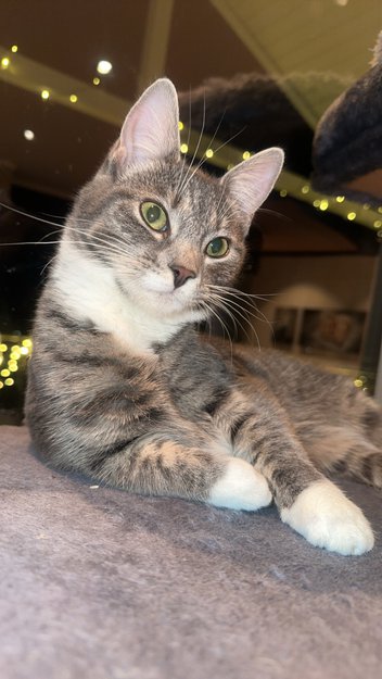 Lykke er ei lita, korthåret Hunnkatt. Lys grå, med mørkere grå striper, hvitt i brystet og hvite poter.