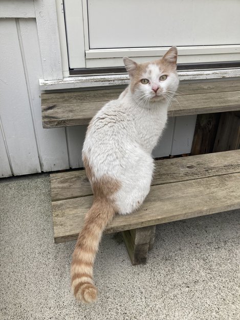 Hvit katt med oransje rundt øynene, bakerst på ryggen og halen. Striper oransje hale. Virker snill og kontaktsøkende. Lar seg ikke fange.