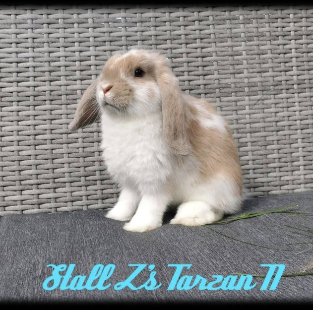 Han er en beige og hvit dvergvedderhann, har tatovert 221 i venstre øre og 29F1 i høyre øre.