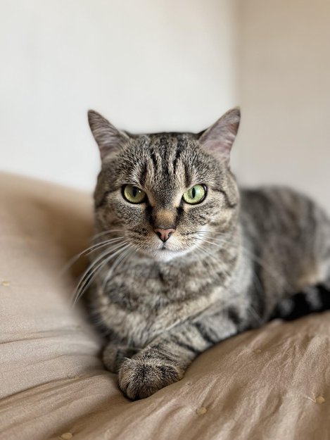 Gråstripet med litt brunt innimellom og på magen, ID tattovering i øret. Hun er overvektig, rundt 6,3 kilo og har hengende mage.